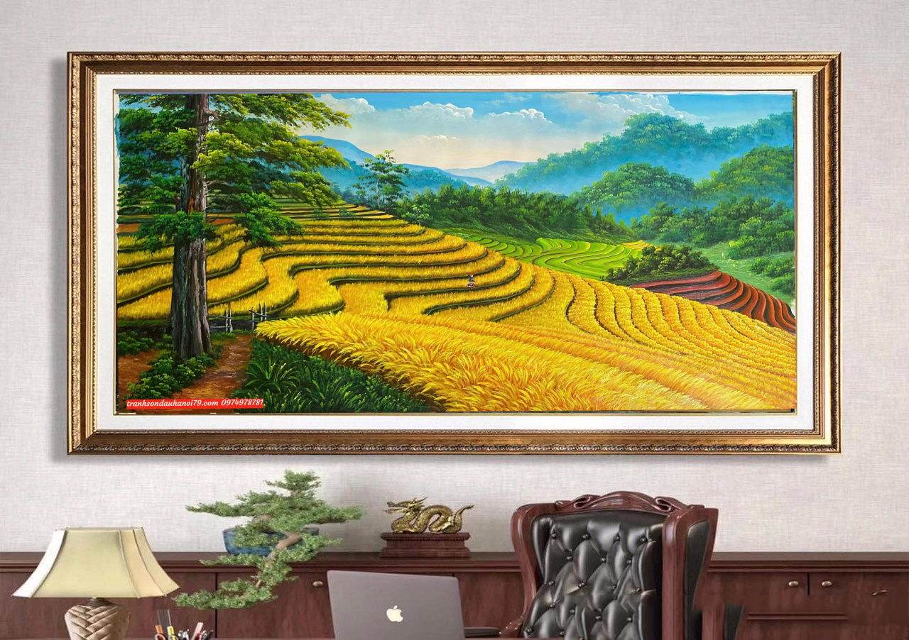tranh sơn dầu ruộng bậc thang tây bắc bức tranh sơn dầu vô cùng đẹp ý nghĩa, tranh được rất nhiêu người ưu thích lựa chọn làm quà tặng quà biếu tranh mang đến vẻ đẹp thiên nhiên vô cùng ấm cúng sang trọng, tranh bối cảnh tinh tế mang đến chúng ta cảm nhận được vẻ đẹp bưc tranh, tranh sơn dầu bức tranh được khách hàng luôn tin tưởng mang đến vẻ đẹp thuần khiết vẻ đẹp sang trọng, trannh vẽ bối cảnh tây bắc lúa chín vàng ruộng bạc thang màu lúa chín thơm đẹp